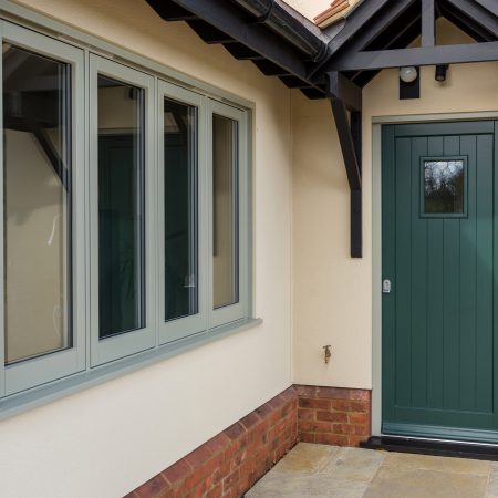 Having debated a number of different colour options, the couple eventually went for LG79 to match Little Green’s Normandy Grey for the outside of the windows and RAL 9016 white inside. The entrance doors were painted in RAL LG306 Three Farm Green with white inside and the frame work LG79 to match the windows. Tying into the Gable’s eaves, the couple chose weather boards for the doors in an ebony stain which creates an elegant and unique colourway.